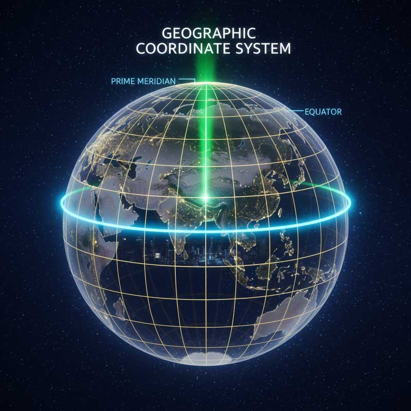سیستم مختصات جغرافیایی (Geographic Coordinate System – GCS) مجموعه ای از قوانین و تعاریف ریاضی و هندسی است که به ما امکان می دهد هر نقطه ای روی سطح زمین را دقیقاً و بدون ابهام مشخص کنیم. تصور کنید سطح زمین را با تور یا شبکه ای از خطوط فرضی پوشانده باشیم. این خطوط شامل مدارها (Parallels) که به صورت افقی و موازات خط استوا رسم شده اند، و نصف النهارها (Meridians) که به صورت عمودی از قطب شمال تا قطب جنوب کشیده شده اند، هستند. محل برخورد این دو دسته خطوط، ترکیبی از عدد طول و عرض جغرافیایی را تشکیل می دهد که مانند آدرس خانه ها در یک شهر، مختصات هر نقطه از کره زمین را می سازد.