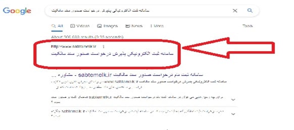 1.در ابتدا کلمه گوگل را در آدرس بار مرورگر خود وارد نمایید تا سایت گوگل برای شما باز شود سپس با وارد کردن عبارت” سامانه ثبت الکترونیکی پذیرش درخواست صدور سند مالکیت” برای شما اولین گزینه سایت سامانه ثبت الکترونیکی پذیرش درخواست صدور سند مالکیت نمایش داده خواهد شد. روی آن کلیک کنید تا وارد سامانه مذکور شوید.