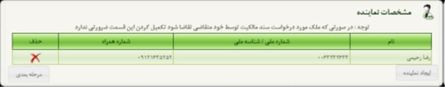 8.در این مرحله به صفحه نماینده می رسیم در صورتی که توسط نماینده شخص حقیقی یا حقوقی، فرم تقاضا نامه پر شده باشد مشخصات نماینده تقاضا نامه در این بخش درج خواهد شد، اما زمانی که درخواست سند مالکیت توسط خود متقاضی برای ملک مورد نظر تقاضا شده باشد پر کردن این صفحه ضرورتی نخواهد داشت.
