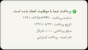 پس از اینکه مشخصات کارت بانکی خود را در صفحه درگاه پرداخت اینترنتی وارد کردید و دکمه پرداخت را کلیک کردید در صورت صحیح بودن اطلاعات بانکی، پیغامی با مضمون موفقیت آمیز بودن پرداخت به همراه جزییات آن نمایش داده می شود.