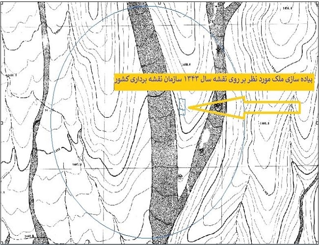 در این تصویر نیز ملک را بر روی نقشه سال ۱۳۴۳ پیادهسازی کرده ایم،پیادهسازی ملک بر روی این نقشه ها برای دادگاه و تصمیم های قاضی بسیار حائز اهمیت می باشد.