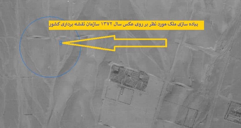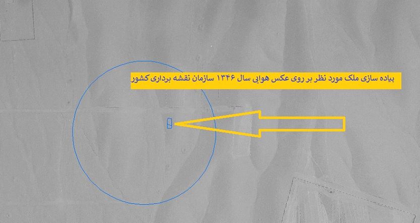 در تصویر بالا ملک را بر روی عکس هوایی سال ۱۳۴۳ سازمان نقشه برداری کشور پیاده کرده ایم.